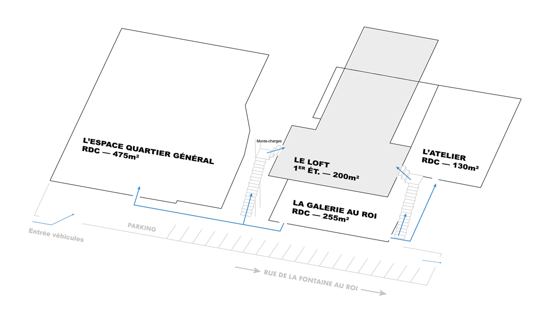 This ephemeral space is available until November 2024. With a total usable surface area of 3400 m2 this building, available for event rentals, consists of :