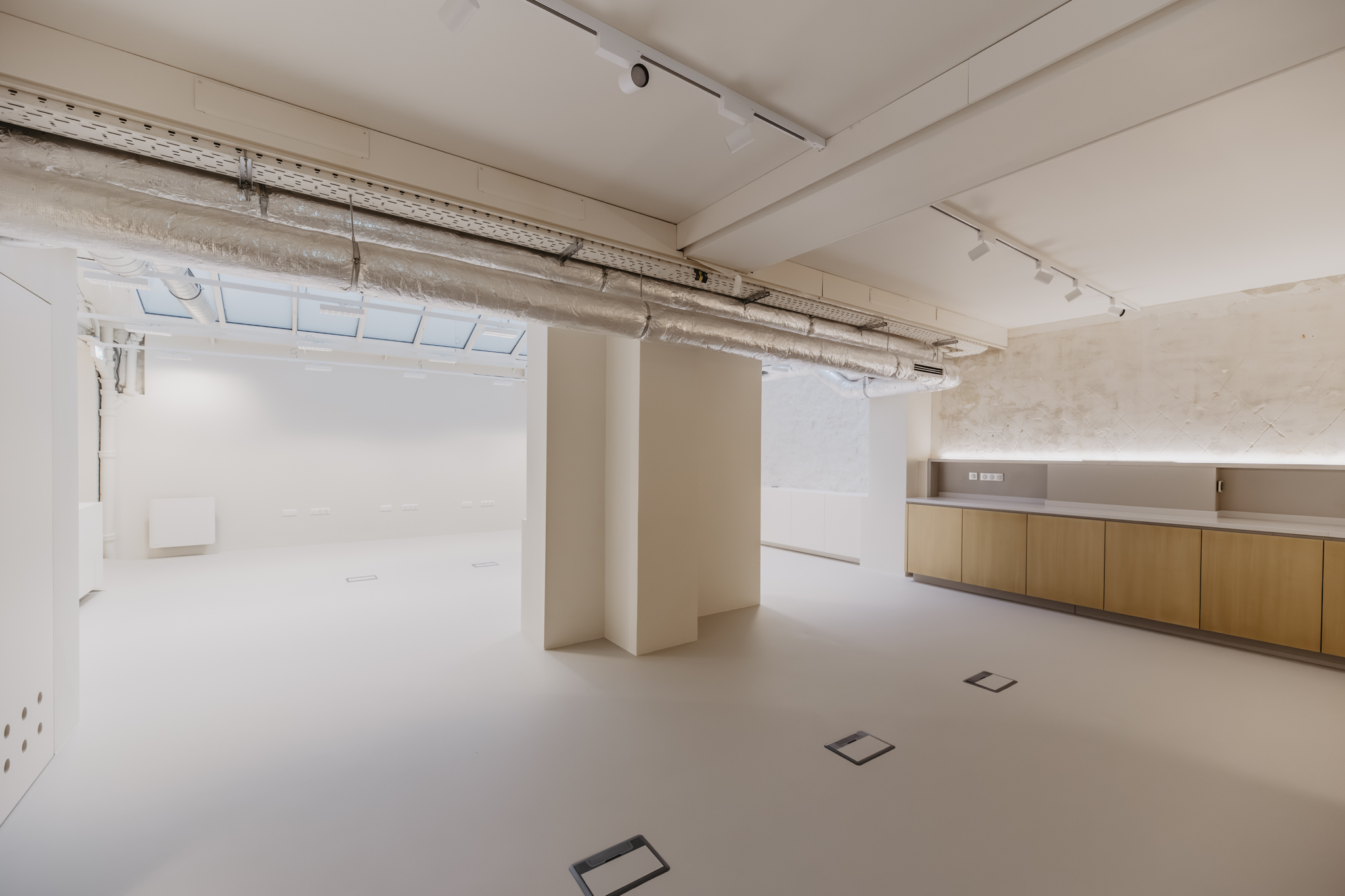 Covering an area of 190 m², this space comprises 140 m² on the ground floor at street level and 50 m² in the basement. Completely renovated by an architect, the venue combines architectural excellence with contemporary functionality. Its electrochromatic glass ceiling modulates natural light, creating a controlled and adaptable atmosphere (the glass becomes opaque at the touch of a remote control). The adjustable and movable gallery lighting allows the lighting design to be precisely tailored.